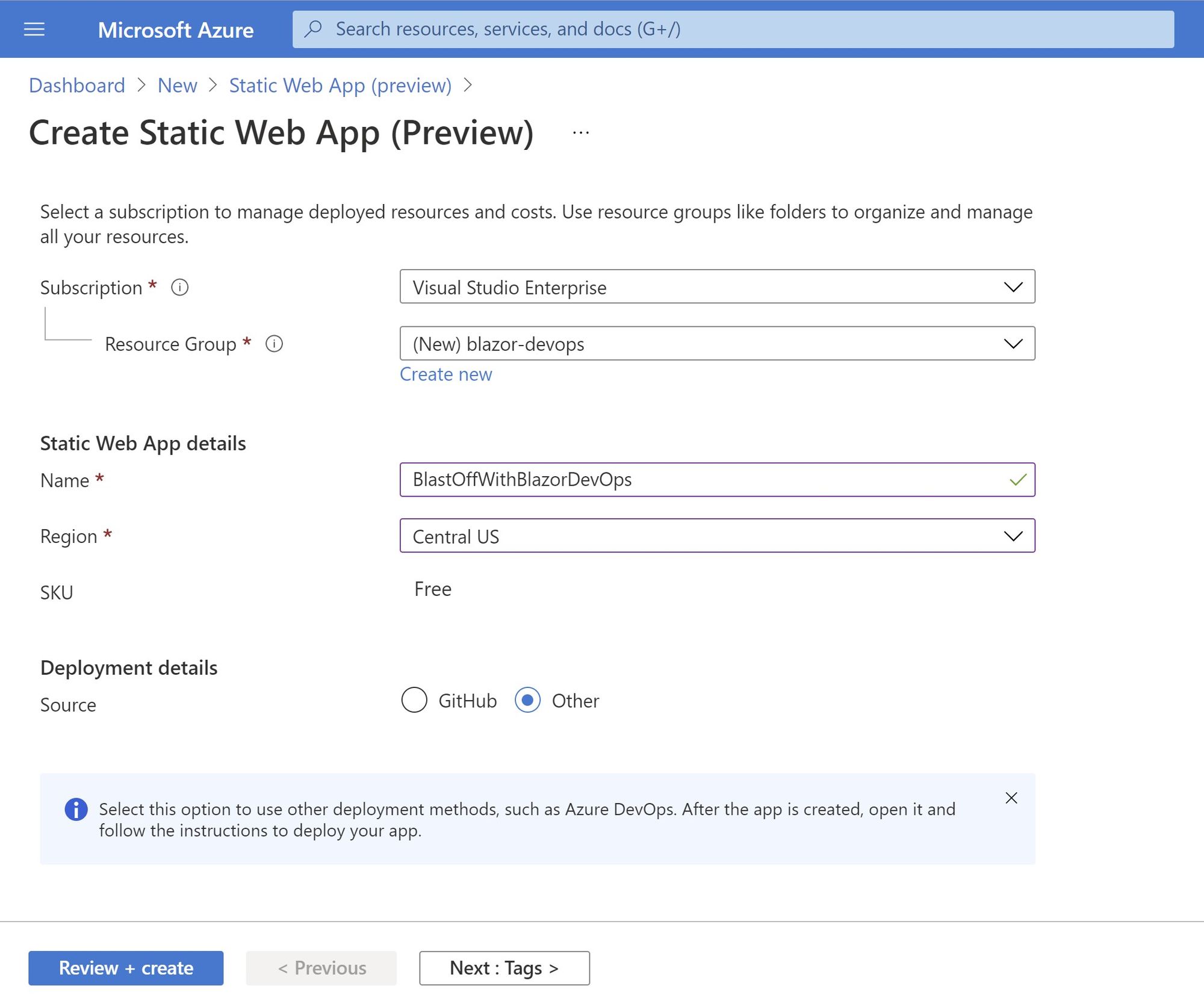 - Enter details for your subscription, resource group, name, and region. Under Deployment details, click Other. This option bypasses the automated GitHub flow and tells Azure you don’t need it.