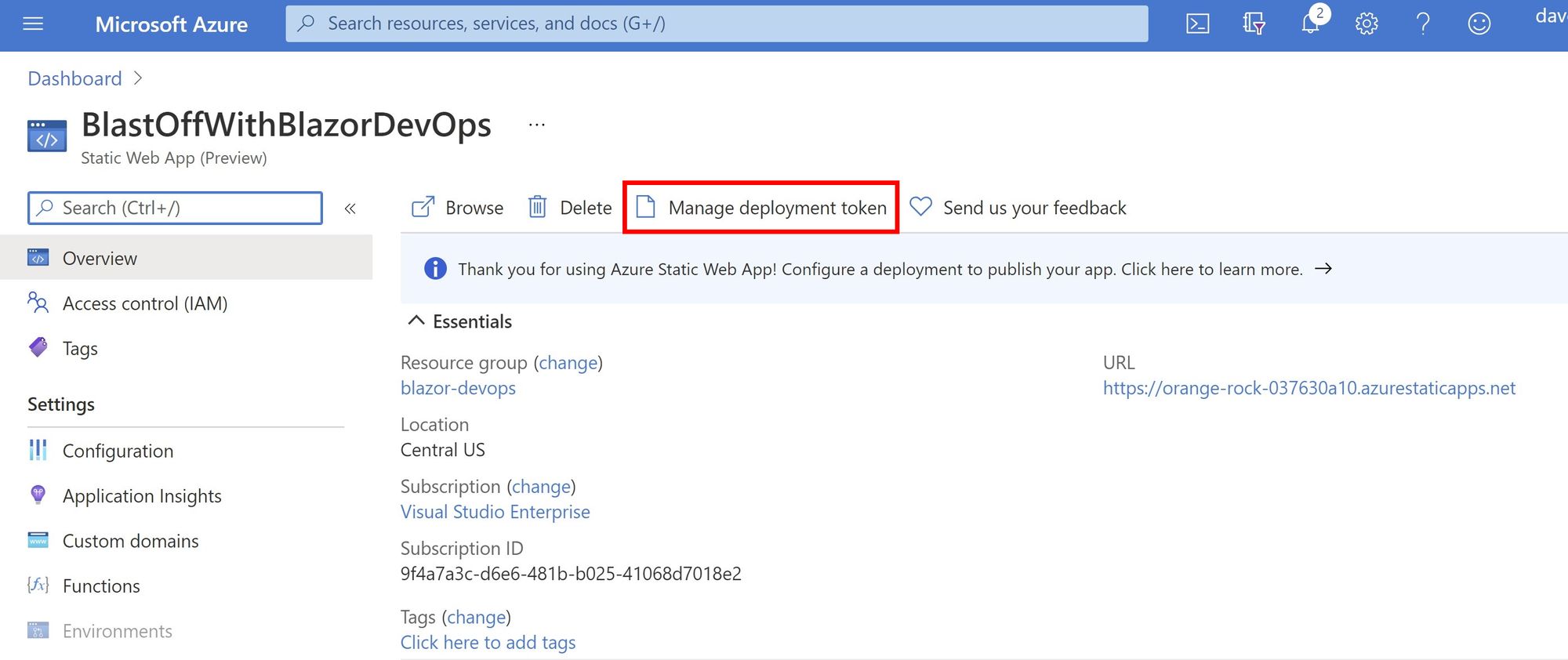 Since you clicked Other when you created your resource, you’ll need to do some manual work to get Azure Static Web Apps working with Azure DevOps. To do so, select Manage deployment token.