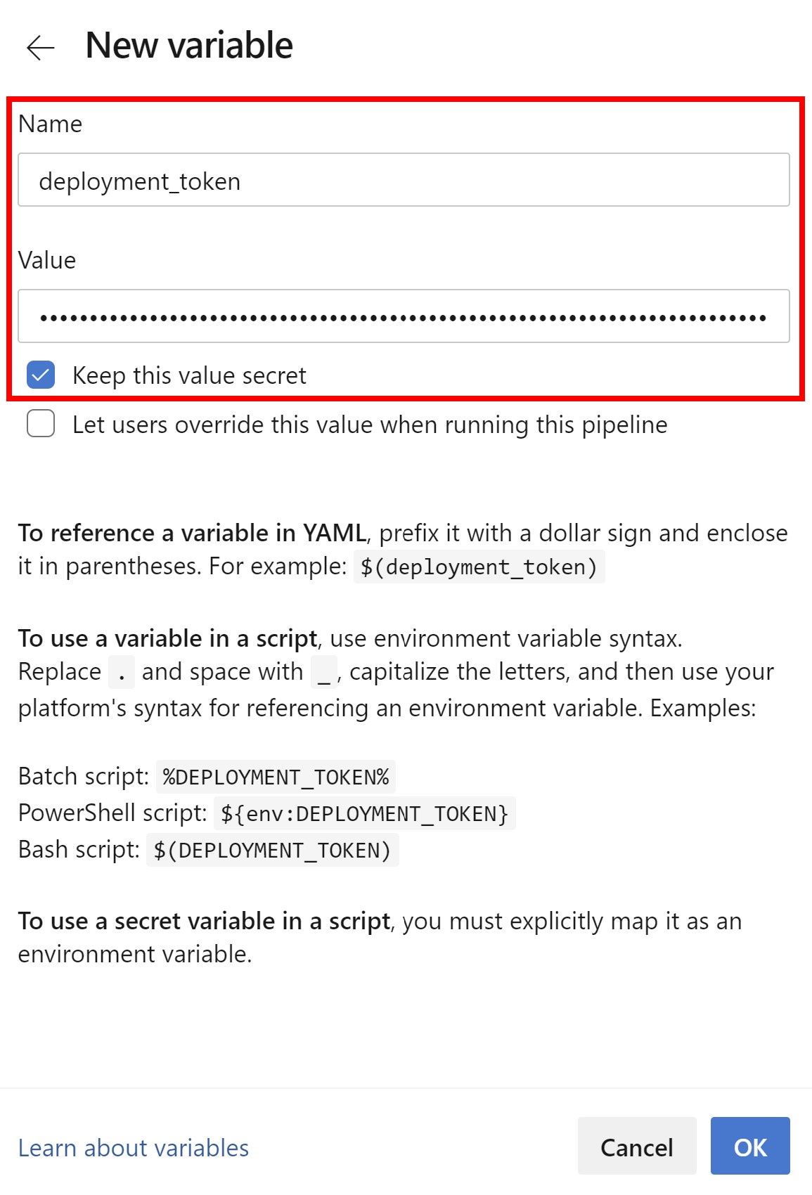 Before we kick off the pipeline, we need to add our Azure Static Web Apps deployment token as an Azure Pipelines variable. To do so, select Variables and create a variable called deployment_token (assuming that’s what you named the value of azure_static_web_apps_api_token). Finally, select Keep this value secret, then click OK.