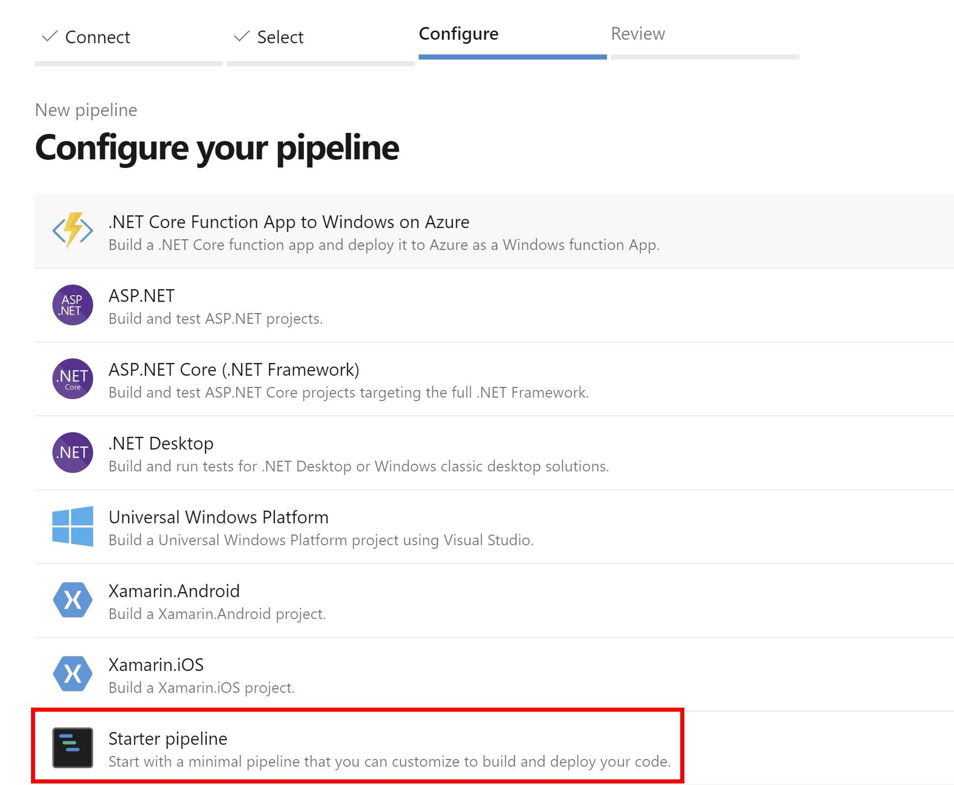 From Configure your pipeline, select Starter pipeline.