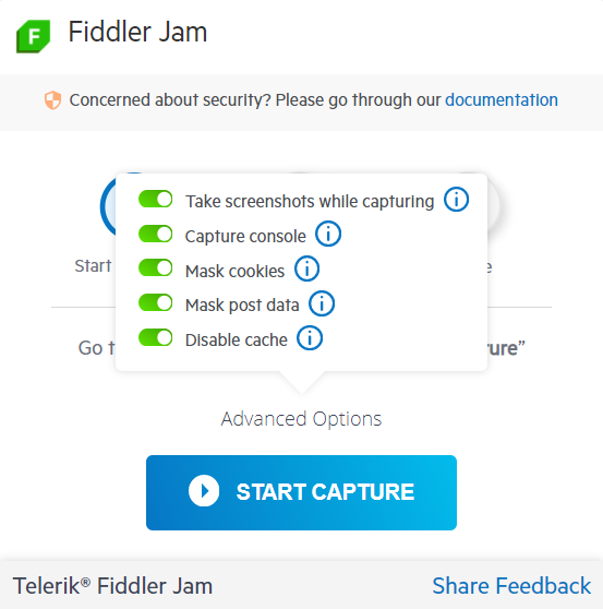 By default, Fiddler Jam also handles the work of sending data securely. If you review the Advanced Options in the Chrome extension, you'll see a few options you can configure based on your security needs. All options are enabled by default.
