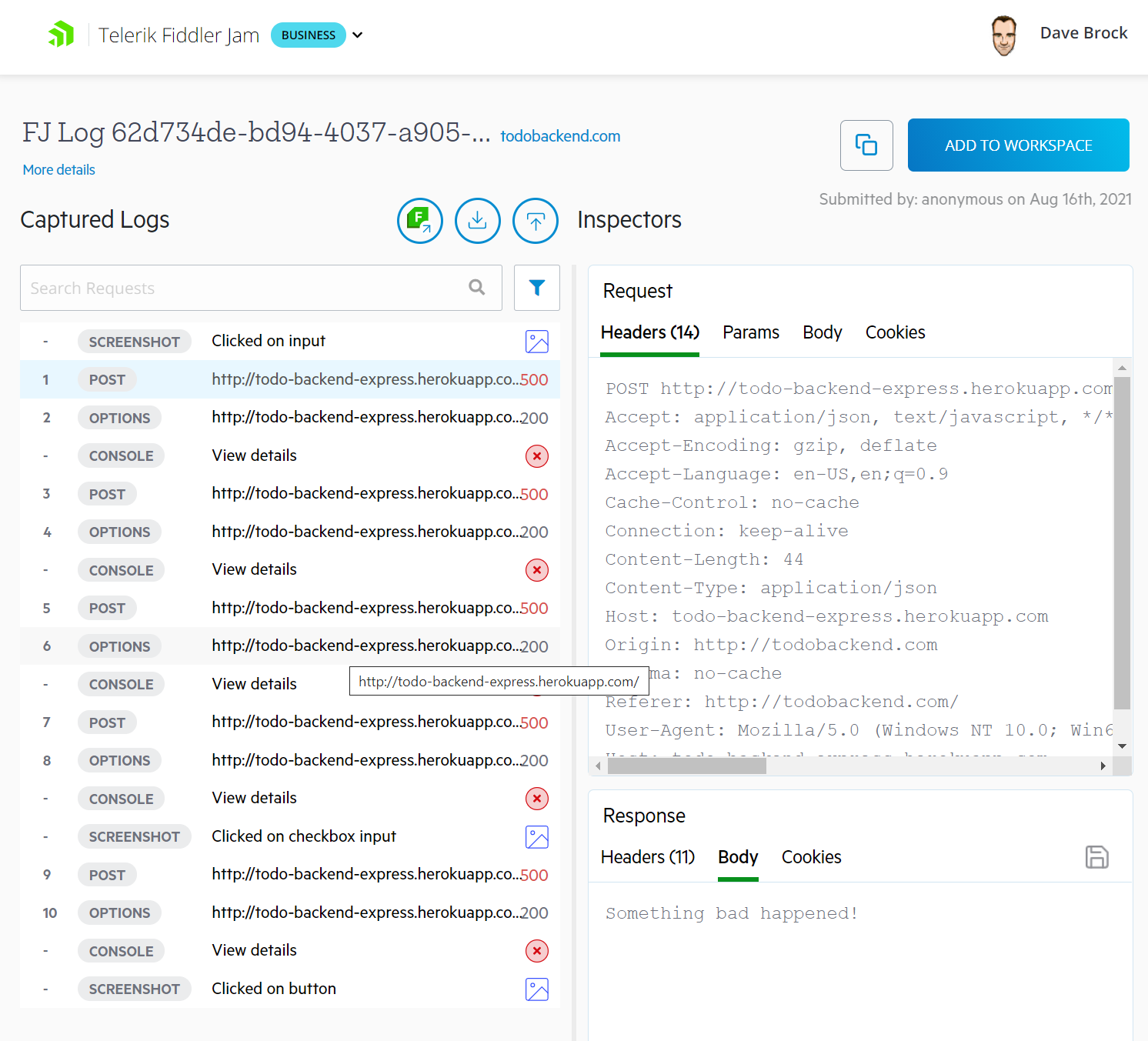 With Fiddler Jam, you can use various tooling options to make the most of the data. When a user shares a link, you'll be sent to the Telerik Fiddler Jam dashboard for a detailed view of the logs and information on the request—like headers and request/response bodies. Here's how it looks when I'm looking at a server error, where I have Something bad happened as a response. (I suppose it is an accurate statement but could use more investigation.)