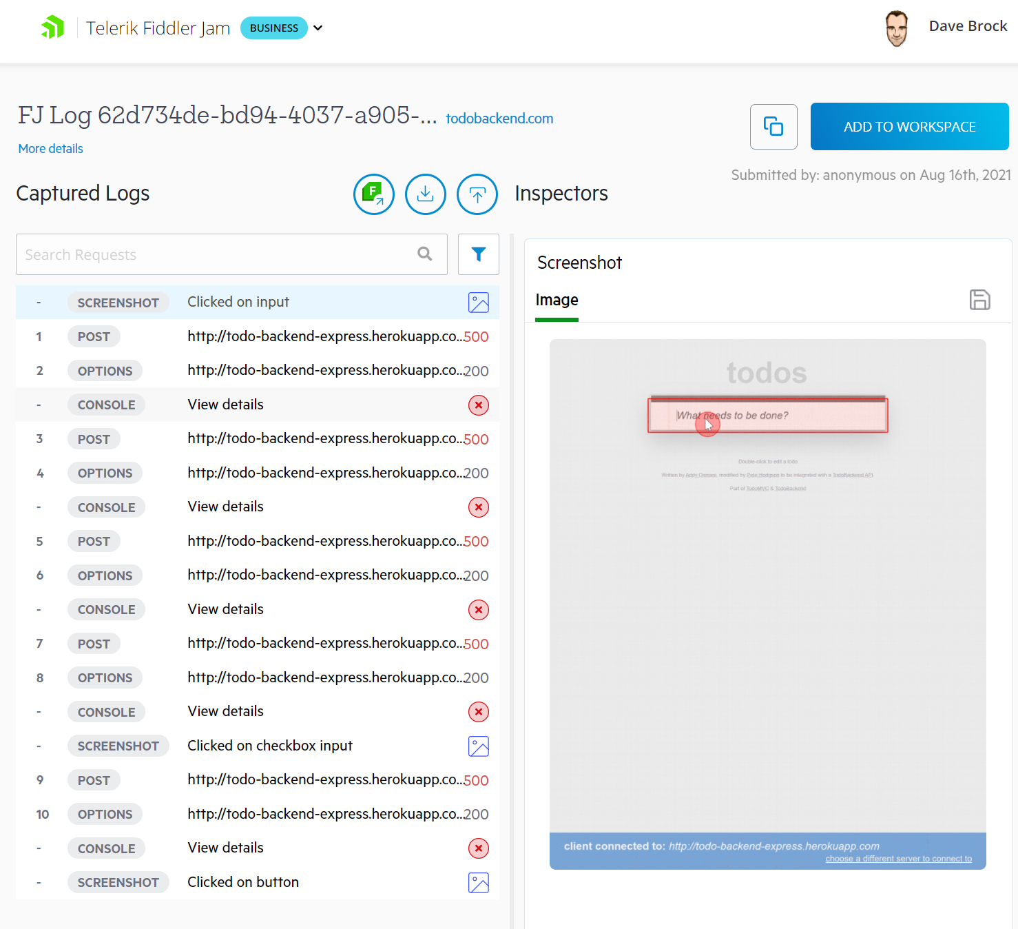 In future versions, Fiddler Jam will take screenshots of more user actions like inputs and scroll events. These actions are stored in the cloud at no additional cost to you. It's one of my favorite features. There's no guessing of what a user said they did and what really happened. It's all here.