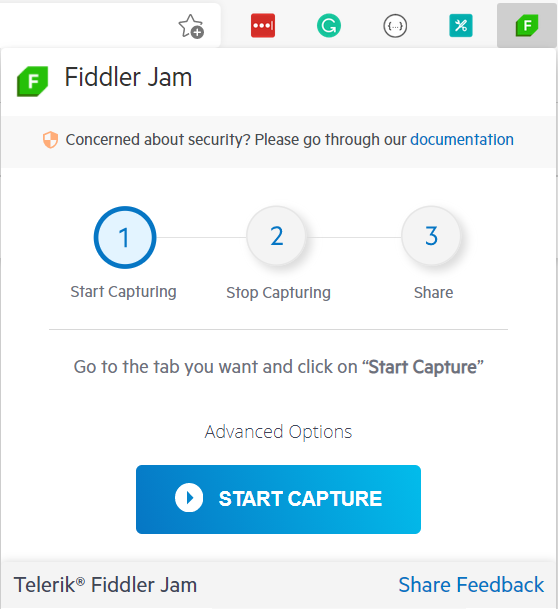 After asking users to download the Fiddler Jam Chrome extension—which you can use with Google Chrome and Microsoft Edge—users will see a Fiddler Jam icon next to the browser's address bar. Users can then click the icon to start capturing the issue.