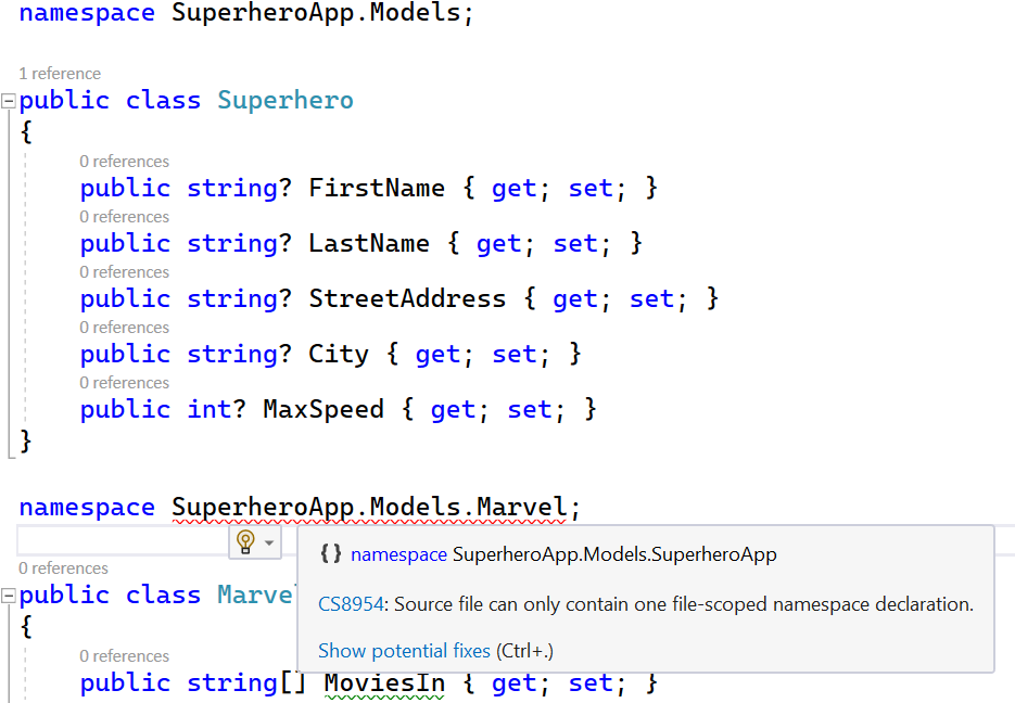 So, how can you declare namespaces in C# 9 and earlier? Keeping with my superhero theme with my C# 9 posts, a Superhero.cs class would look like this: